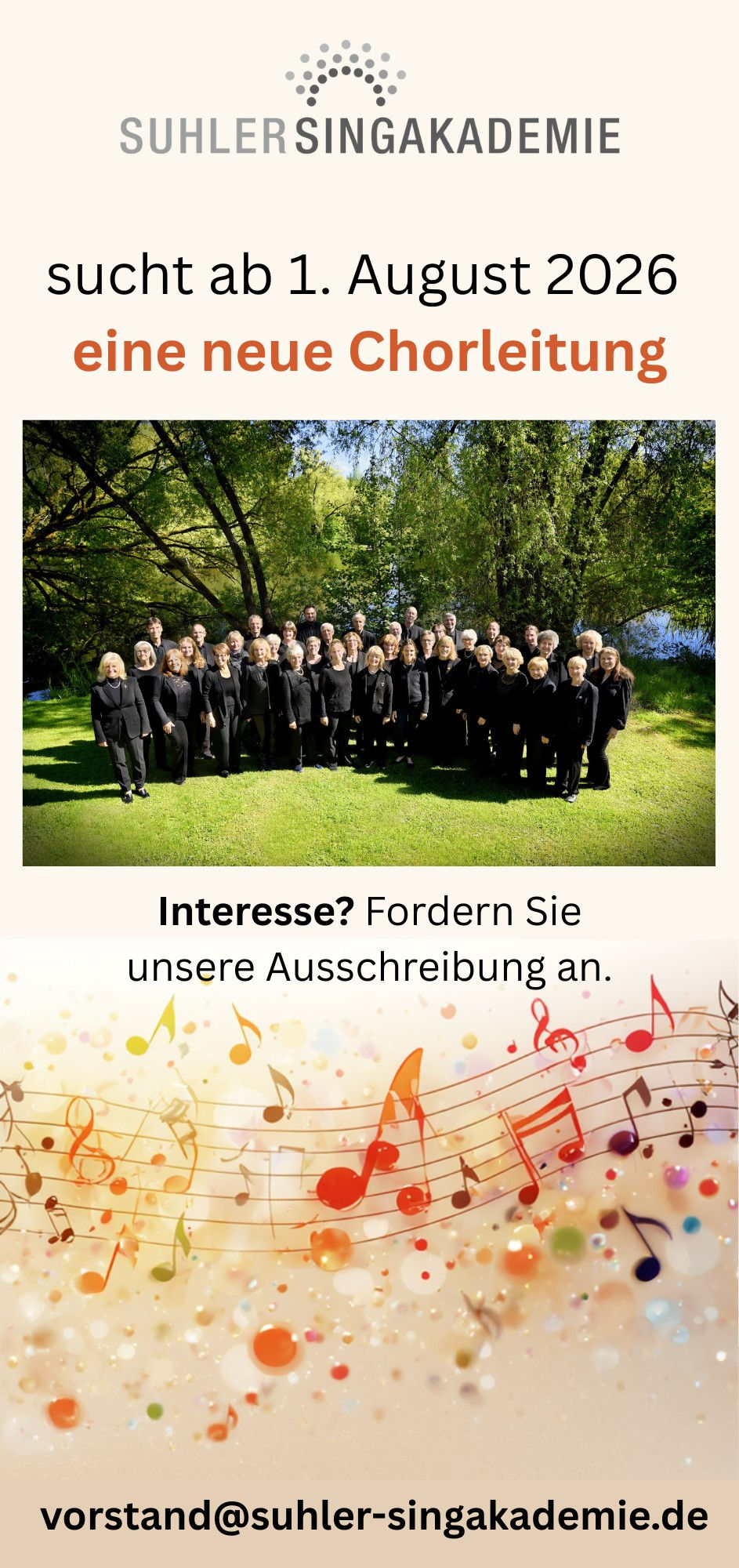 Bewerbungen erbitten wir bis zum 30. April 2026 an unsere Vorstandsvorsitzende Verena Meyer unter vorstand@suhler-singakademie.de. Rückfragen beantworten wir gerne.